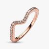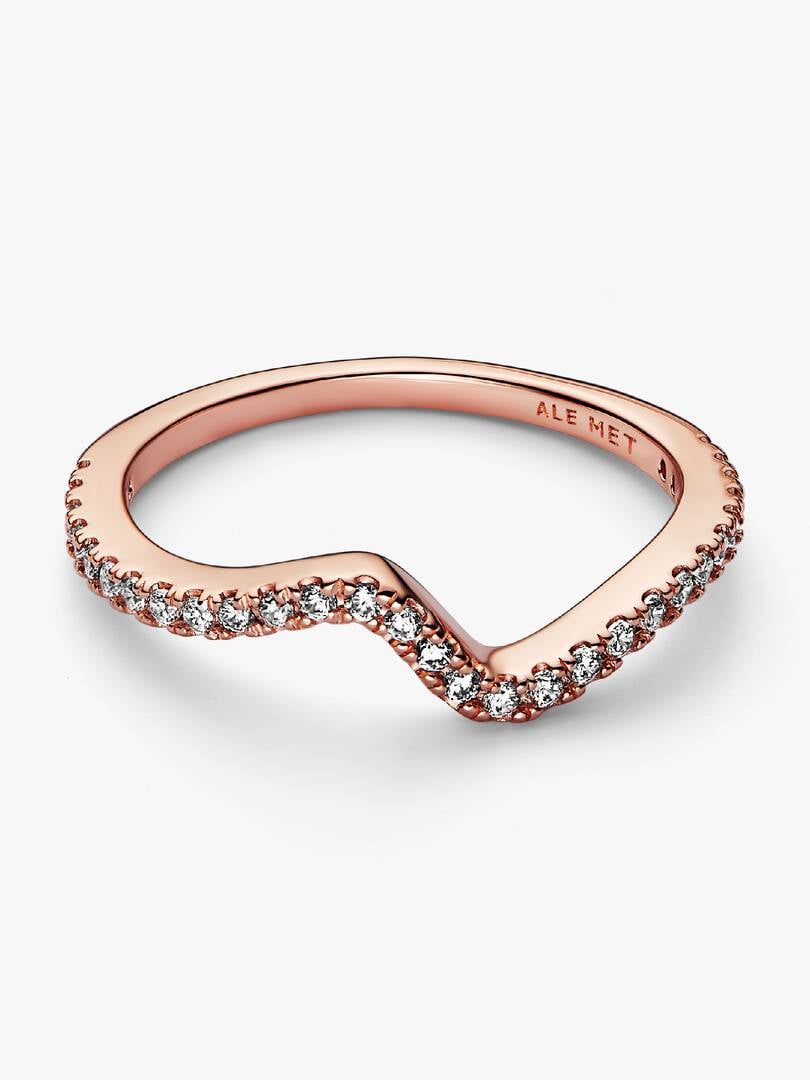 Hand-finished in 14k rose gold plating, our Sparkling Wave Ring curves to resemble the movement of a wave and features a row of round brilliant-cut clear cubic zirconia along its front. Wear it solo or stacked for a cont
