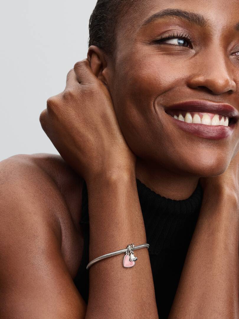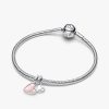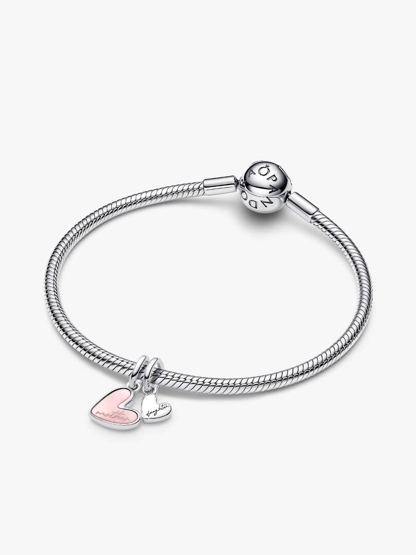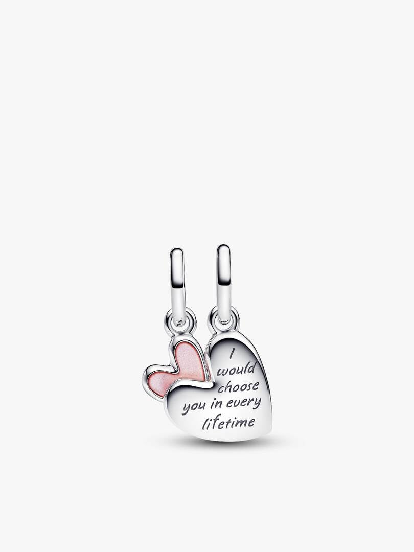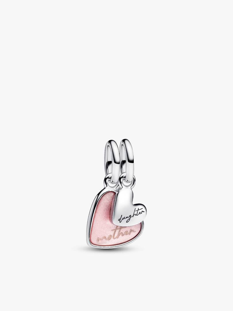 Bring a special bond to life with the Splittable Mother & Daughter Dangle Charm. Designed to be shared, this sterling silver charm features two hearts –a small one and a larger one covered in pink man-made mother-of-pear