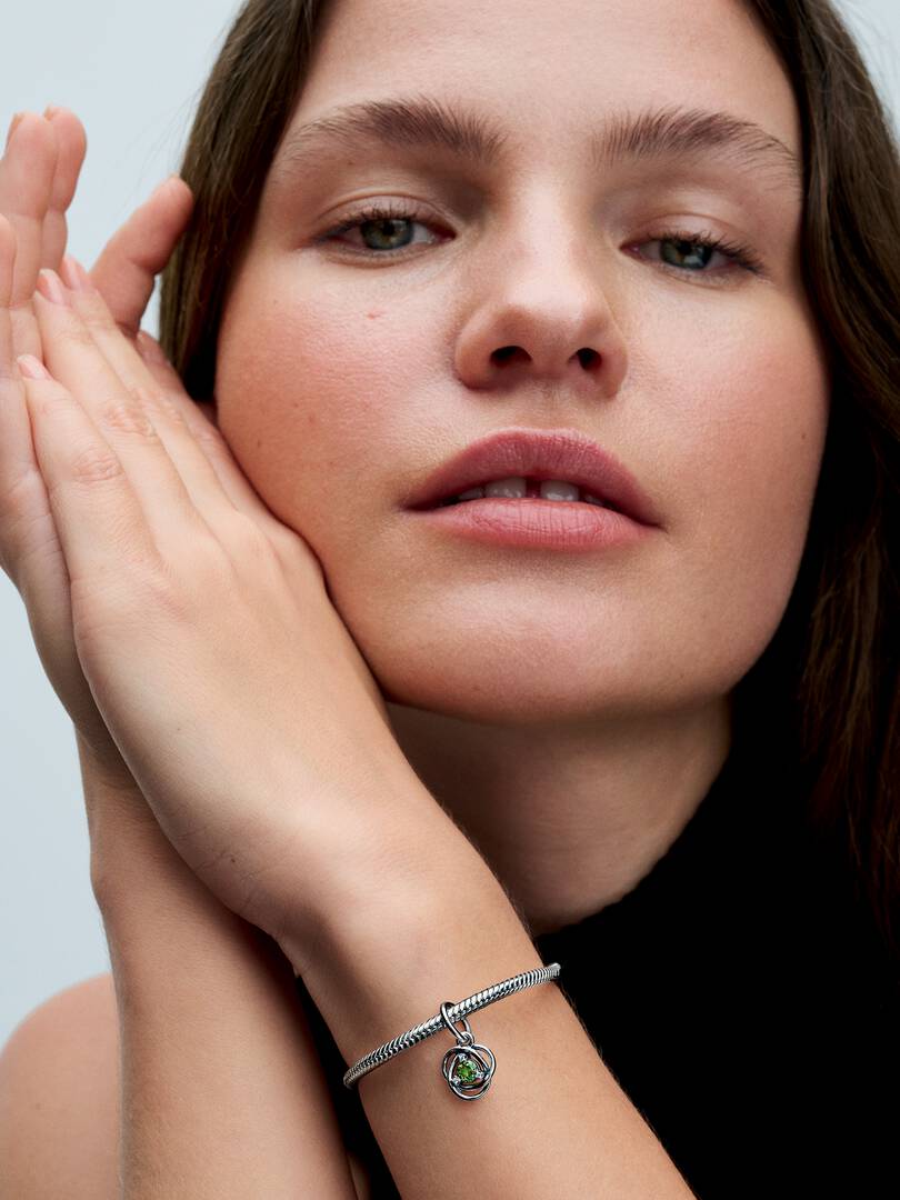 This intricate Spring Green Eternity Circle Dangle Charm is a must-have infinity charm for your brand Moments collection. Crafted in lustrous sterling silver, it features an openwork infinity braid decorated with a cen