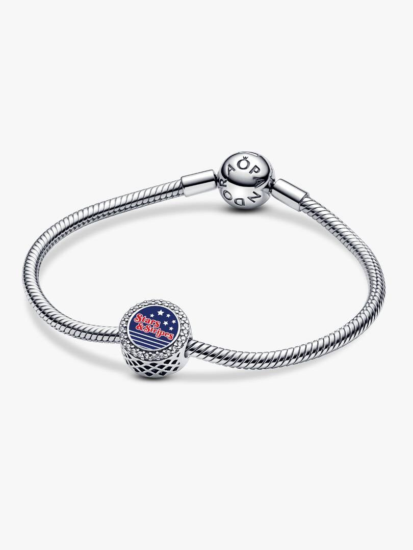 Celebrate the spirit of freedom with the Engravable Stars & Stripes Charm. Crafted in sterling silver with bold red and blue enamel, this charm is a tribute to the American flag and all it represents. The front features