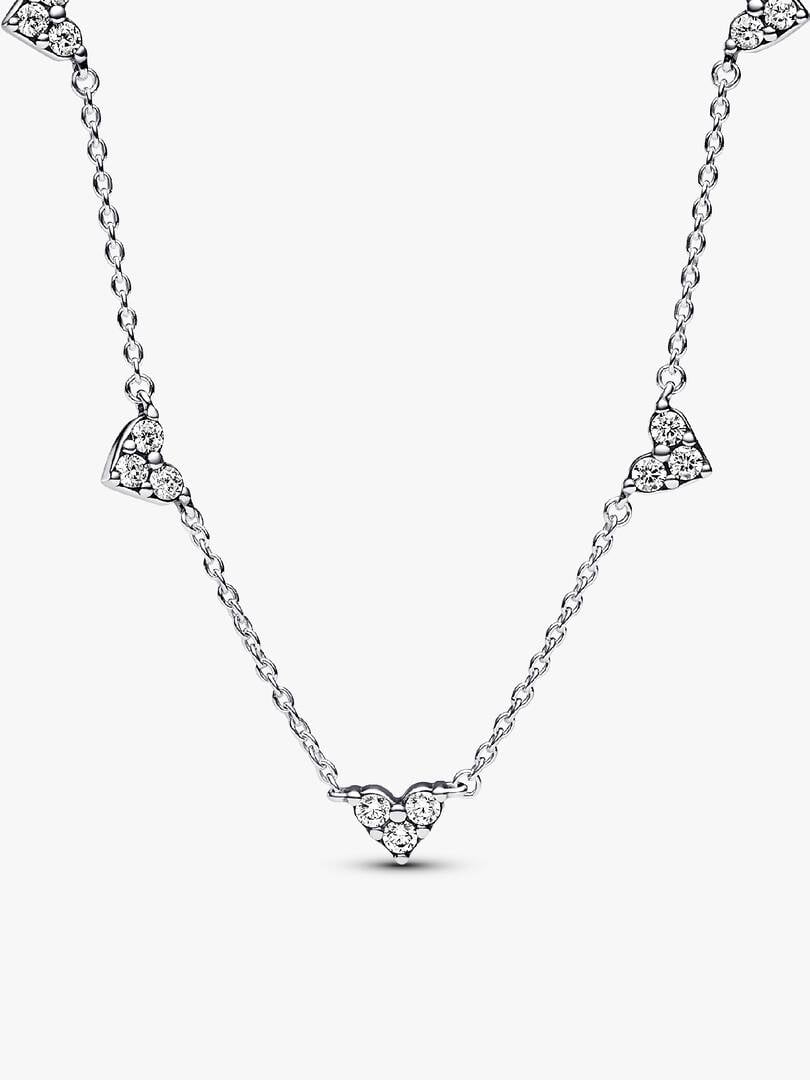 Let your love shine with our Triple Stone Heart Station Necklace and Earring Set. Crafted in sterling silver, our new brand Timeless necklace features five love hearts with equal space in between them. Each heart is se