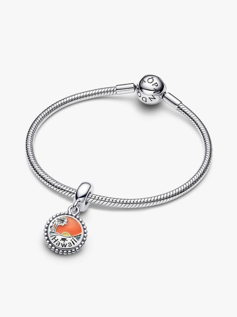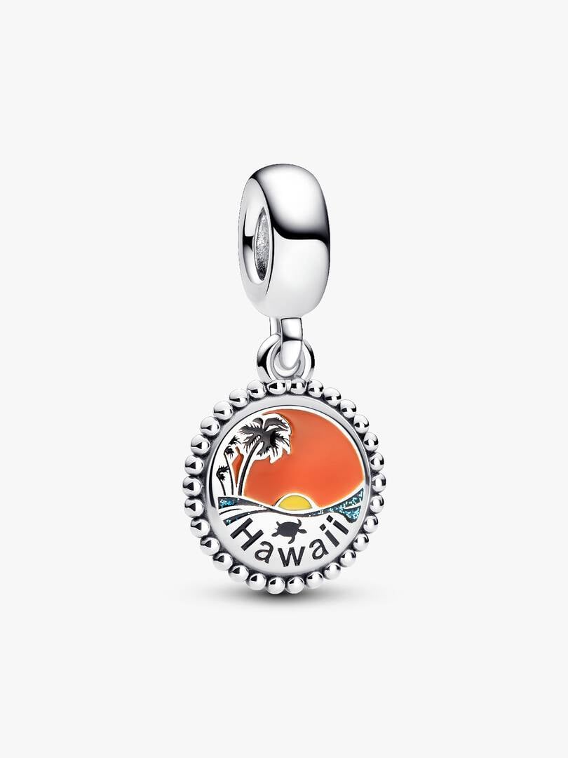 Escape to paradise with this colourful Hawaii charm. Crafted from sterling silver, it features an enamel beach scene on one side above the word “Hawaii”, while the other side is engraved with the brand Crown O. Add it