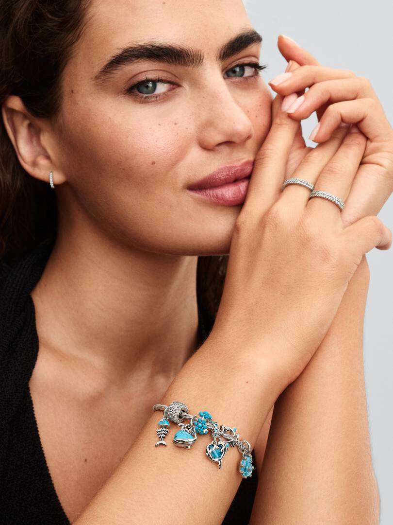 Dive into the depths of the ocean with a whale-inspired charm. Symbolizing power and wisdom, this sterling silver piece features enamel eyes and a wavy bail.
