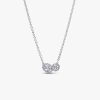 Embrace the power of two with the Embracing Halo Necklace. This sterling silver collier necklace features two sparkling stones –one round and one oval – connected by a pavé halo. An additional stone dangles near the neck
