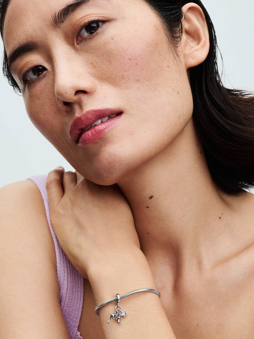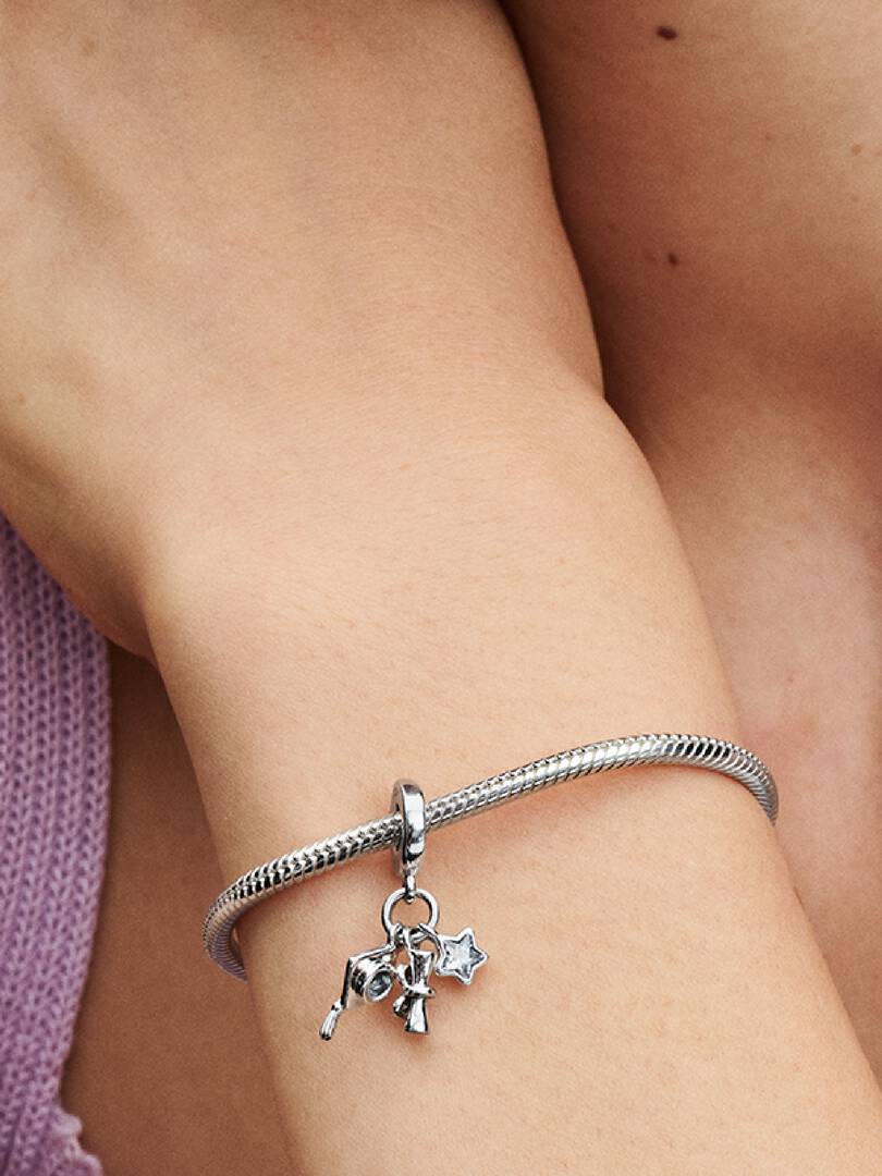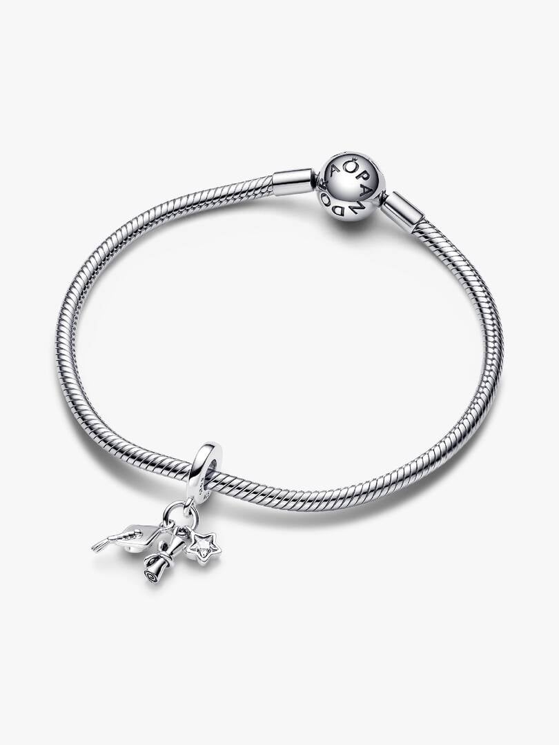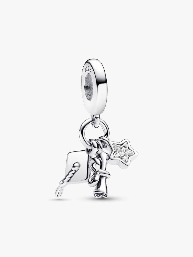 Celebrate your milestone with our 2024 Graduation Triple Dangle Charm, a sterling silver charm capturing the essence of achievement. A star-shaped cubic zirconia gleams alongside a dangling graduation cap with a tasselle