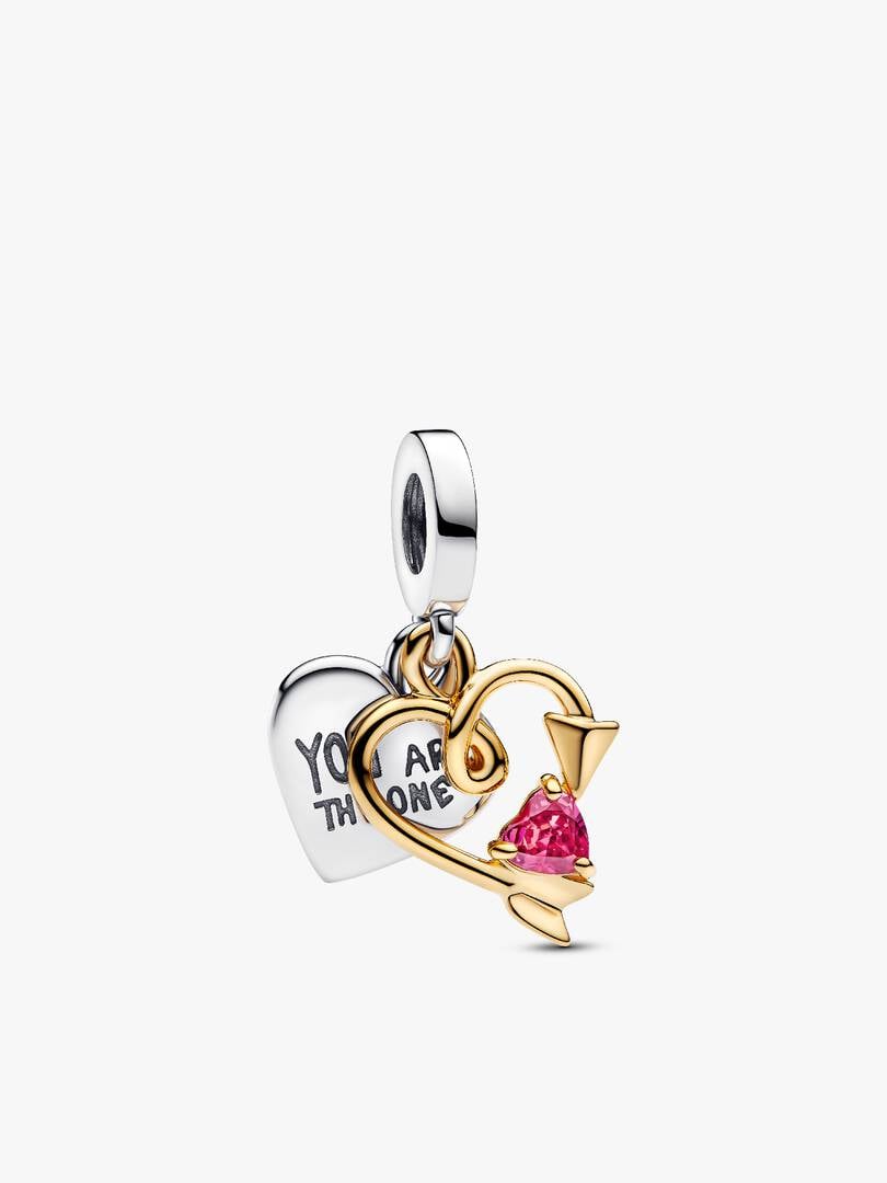 YOU ARE THE ONE” and a blank canvas for personalization. Cupid’s arrow, crafted in 14k gold plating and set with a heart-shaped red stone, adds a touch of romance. The set is completed with the brand Heart Clasp Bracelet, a sterling silver snake chain bracelet featuring a heart-shaped clasp. Wear it as a standalone statement or add your favourite charms to make it uniquely yours.