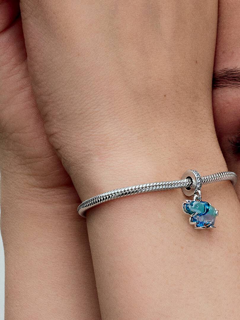 The Blue Murano Glass Elephant Dangle Charm is a colorful ode to a majestic creature. Sterling silver forms an elephant-shaped silhouette around a gradient blue-and-purple Murano glass with a raised ear and a concave rou