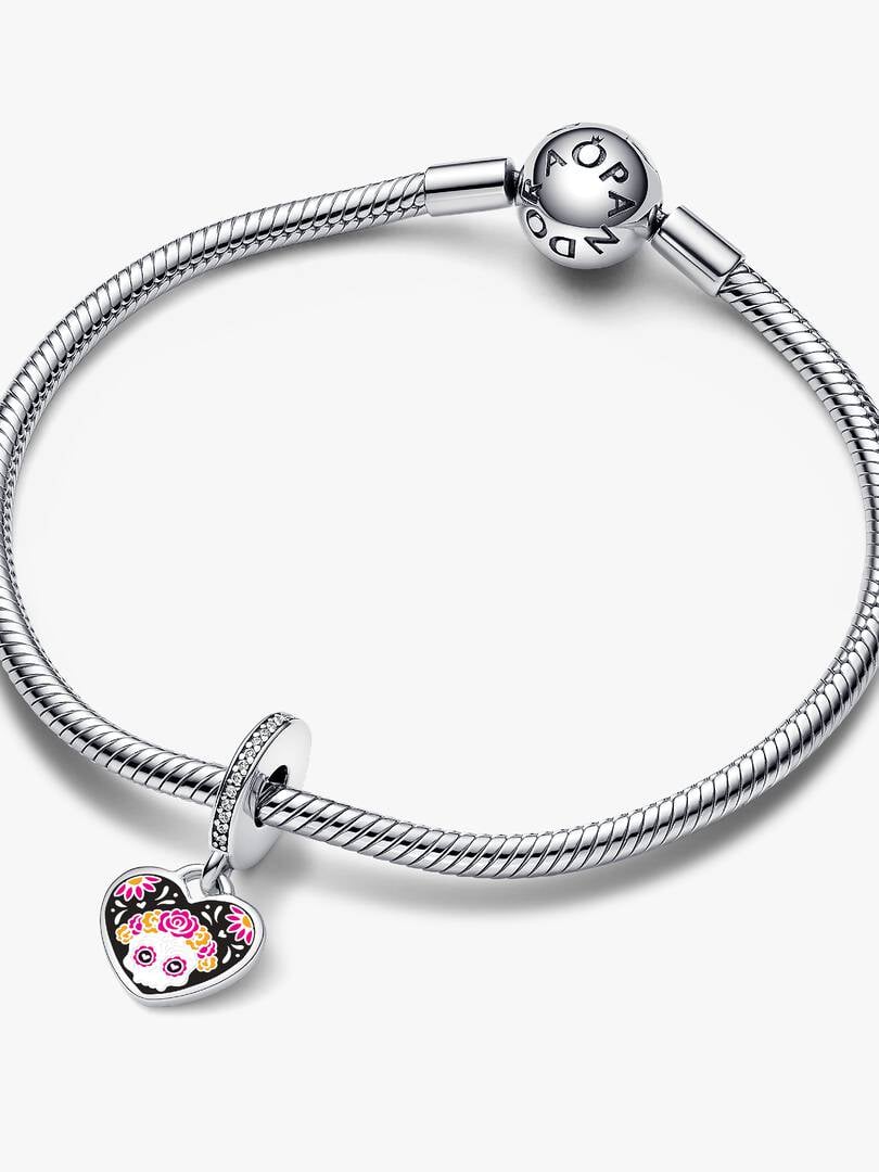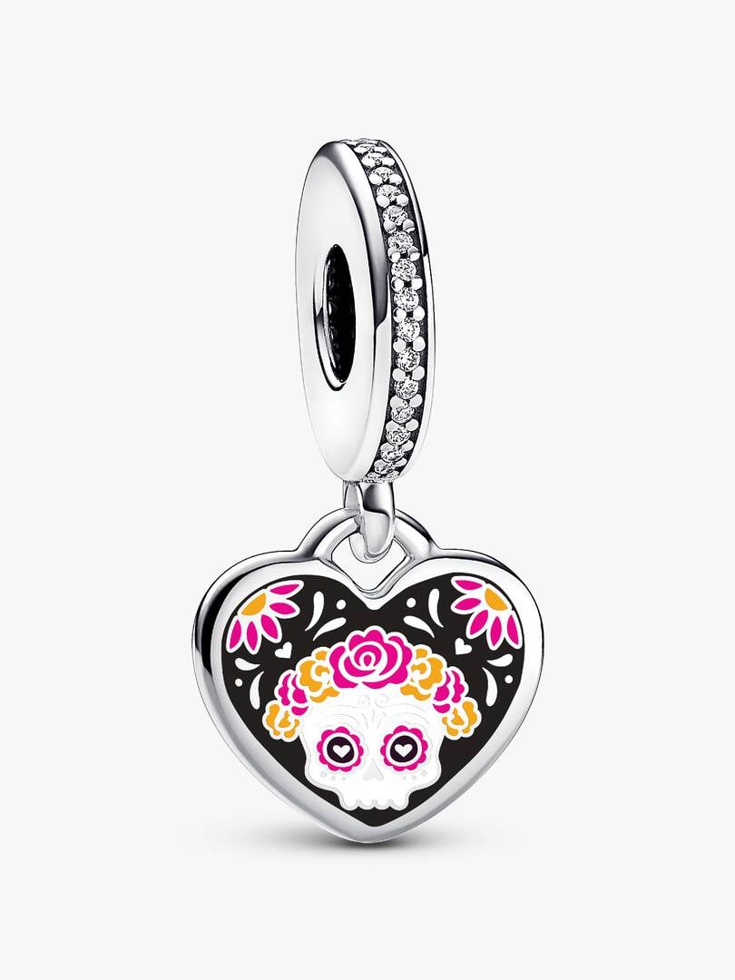 Celebrate the spirit of Día de los Muertos with the Day of the Dead Sugar Skull Charm. This heart-shaped dangle charm is beautifully crafted in sterling silver and features a row of sparkling cubic zirconia on the bale,