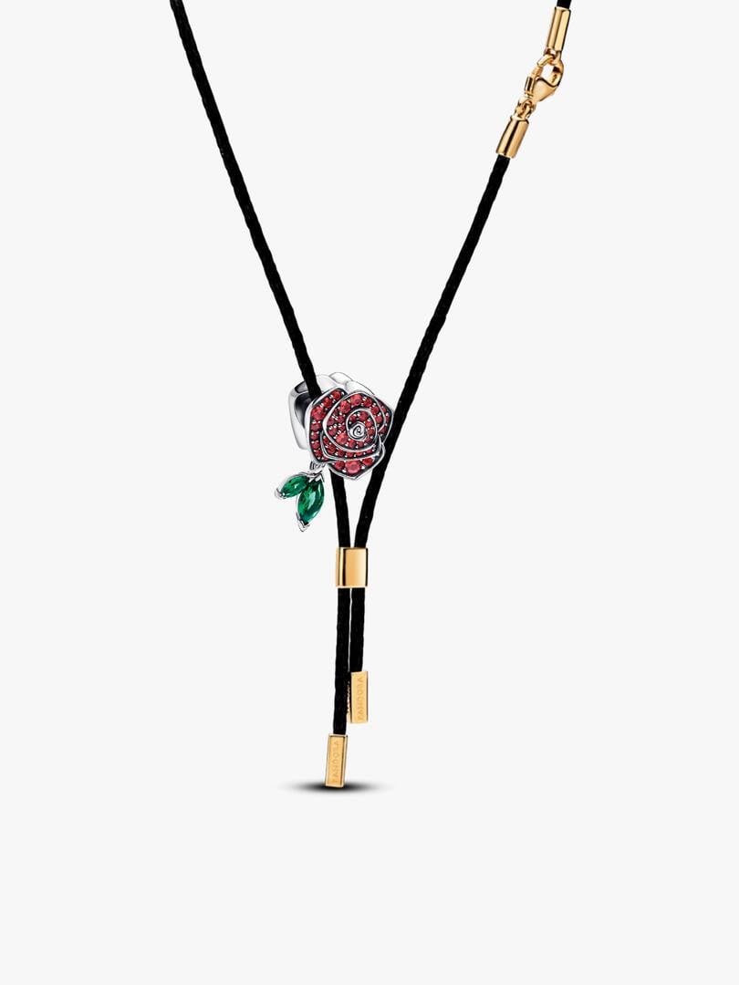 Dark romance meets bold style. This set features a black gothic chocker made from recycled polyester and a sterling silver rose charm set with red man-made crystals. Adjustable for the perfect fit.