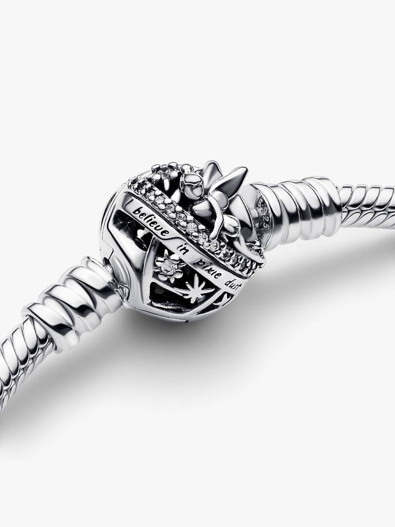 Make every day magical with our Disney Tinker Bell Clasp Moments Snake Chain Bracelet. The round openwork clasp features Tinker Bell holding a sparkling pavé ribbon, as well as the engraved message “I believe in pixie du