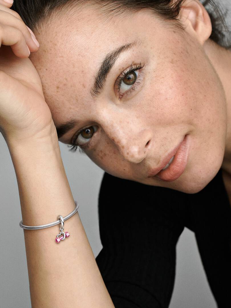 Wear your love for fitness with the Dumbbell & Heart Dangle Charm. Hand-finished in sterling silver, this charm features a dumbbell sitting inside an open heart shape. The dumbbell is covered in hand-applied pink enamel,