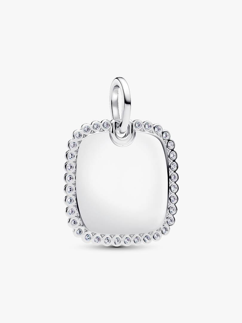 Minimalist style that makes a statement. Add our sterling silver engravable square disc pendant, outlined in a frame of sparkling stones, to your collection.