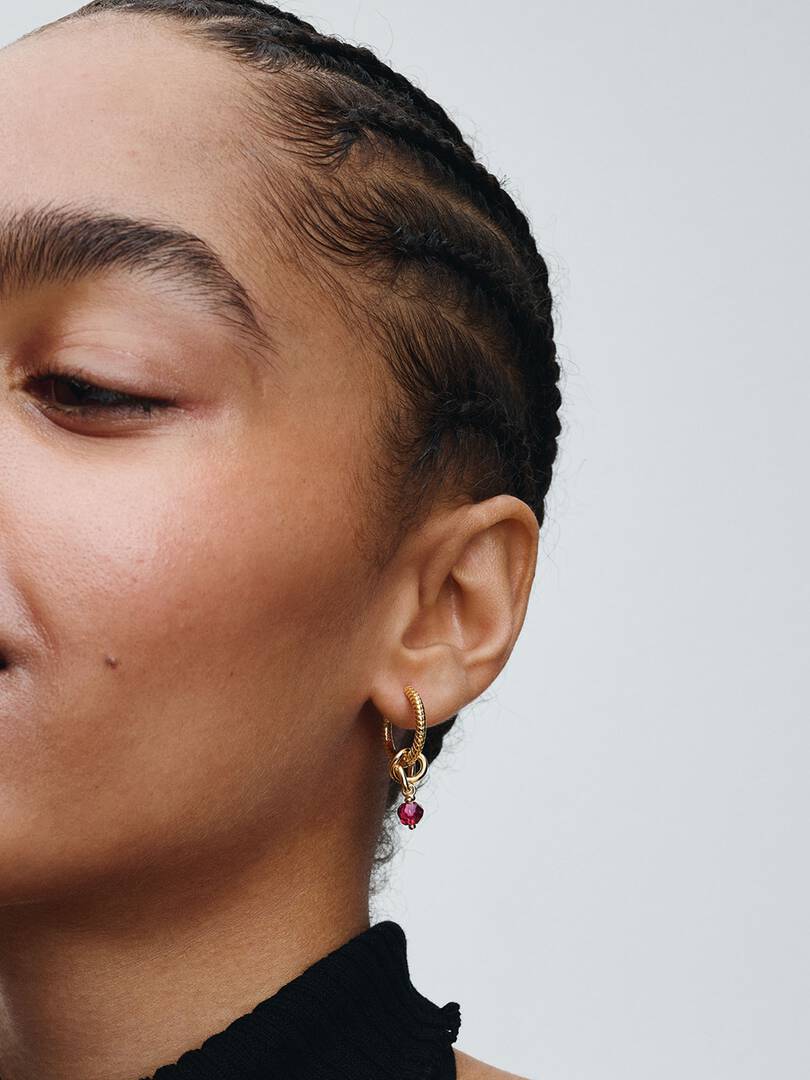 Wear a symbol of forever, that’s personal to you. This 14k gold-plated dangle charm is made up of a triple knotted circle that intertwines to resemble an infinity sign. The twist carries a faceted true red man-made cryst