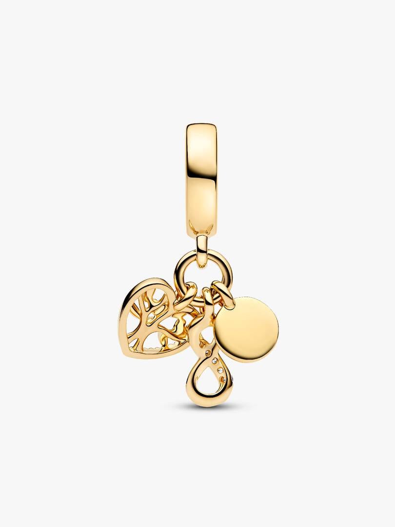 Celebrate the beauty of family with our 14k gold-plated triple dangle charm. Featuring a family tree in a heart, an infinity symbol and a ‘family’ engraving, it’s a symbol of shared love and unity.