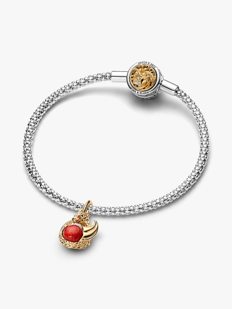 Collect your way through Westeros with the Game of Thrones Dragon Fire Dangle Charm. Here, a Game of Thrones dragon in 14k gold-plated metal wraps its body around a red lab-created opal. Intricately detailed, the dragon