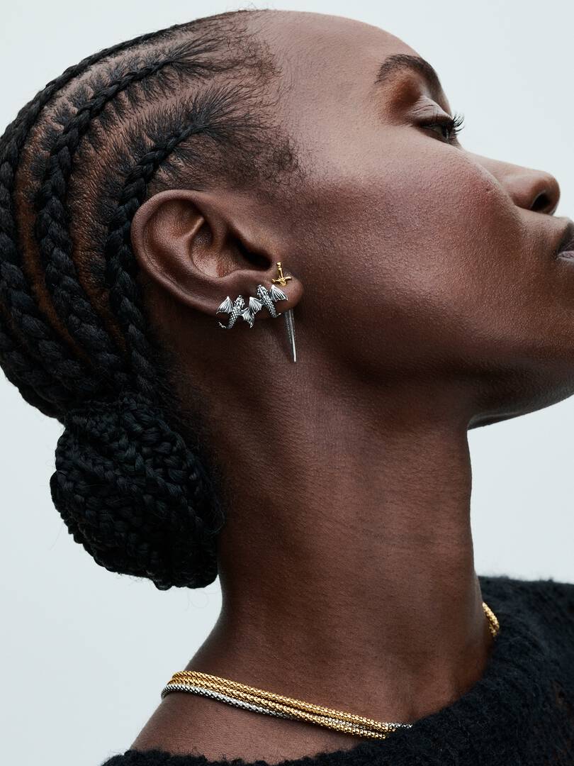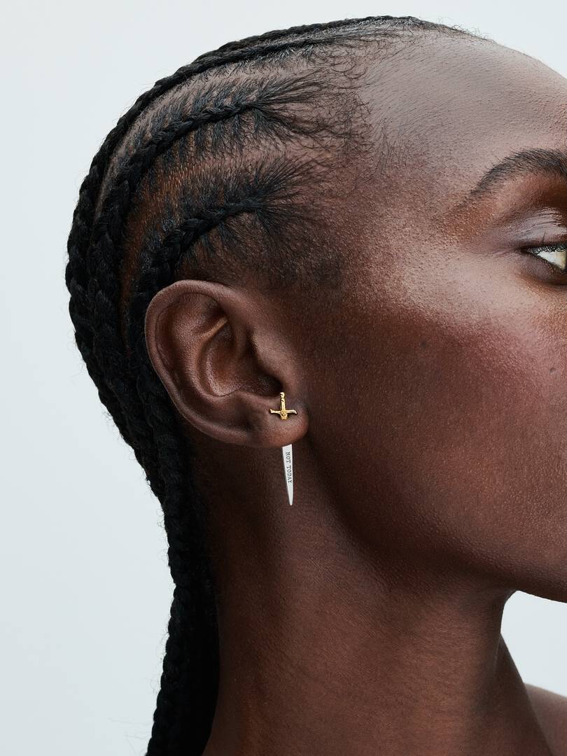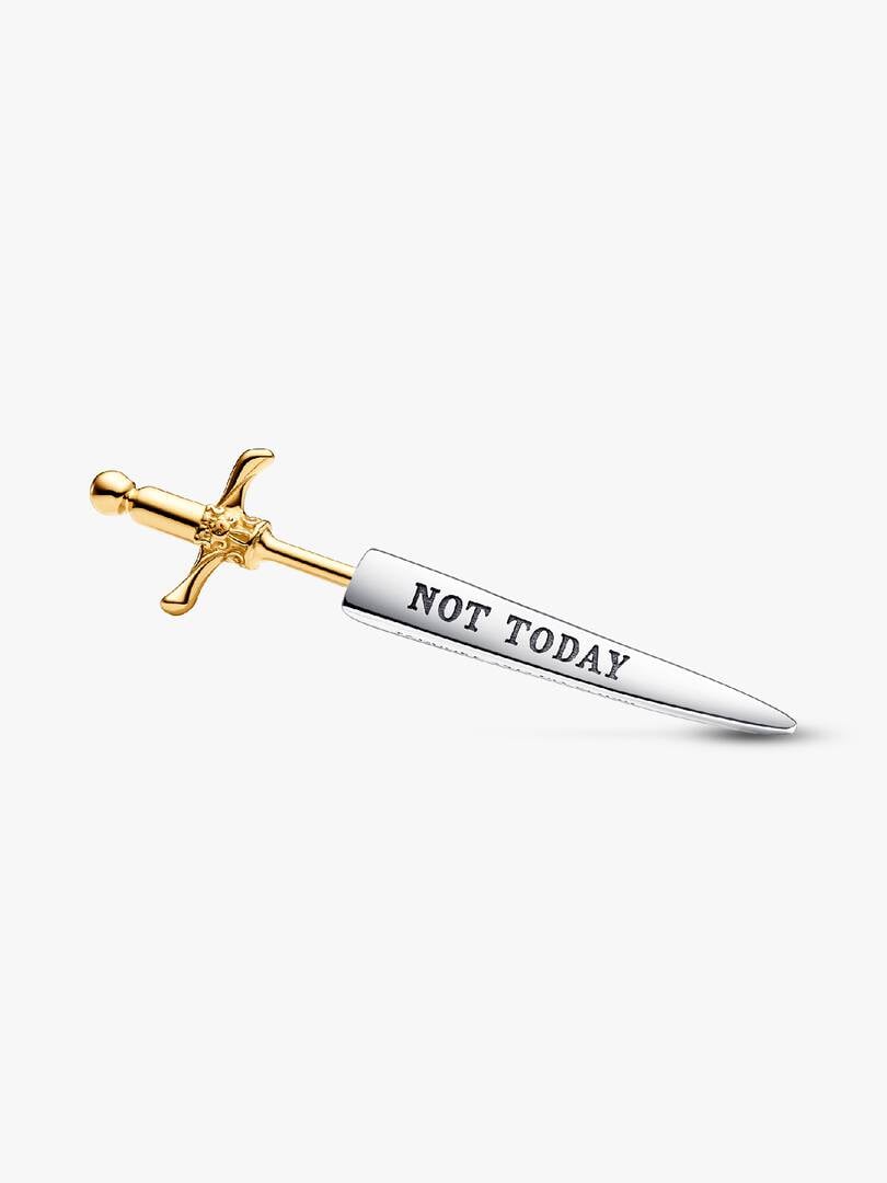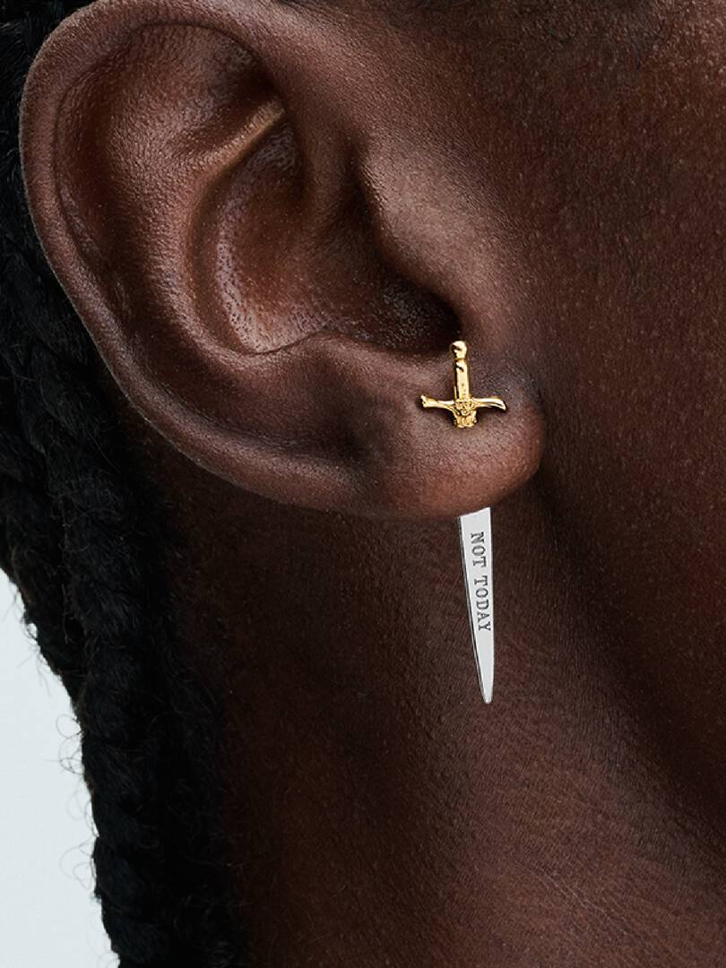 plated hilt with decorative motifs. The earring hangs at an angle and was designed to be worn with the gold-plated section to face the front to achieve the full effect. Featuring the engraving “NOT TODAY”, it’s the perfect piece for your collection or the Game of Thrones fan in your life.