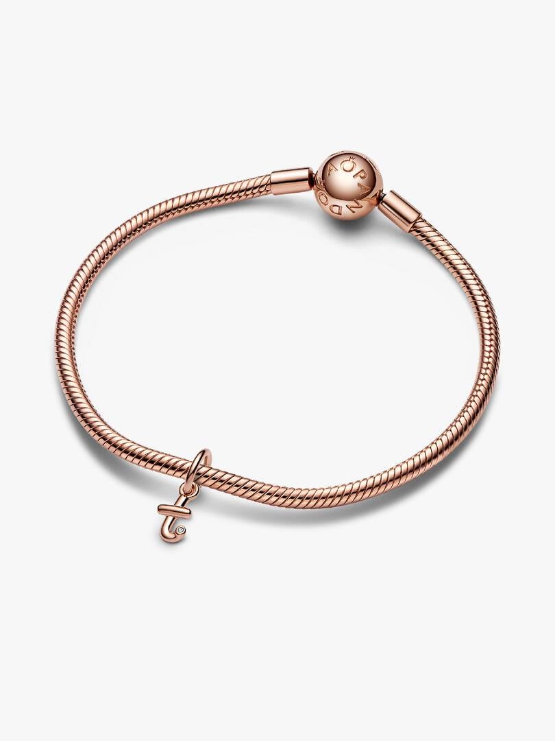 Spell it out with our Letter t Script Alphabet Dangle Charm. Inspired by bent wire and the movement of a pen across paper, this 14k rose gold-plated charm features a three-dimensional letter T that looks handwritten. The