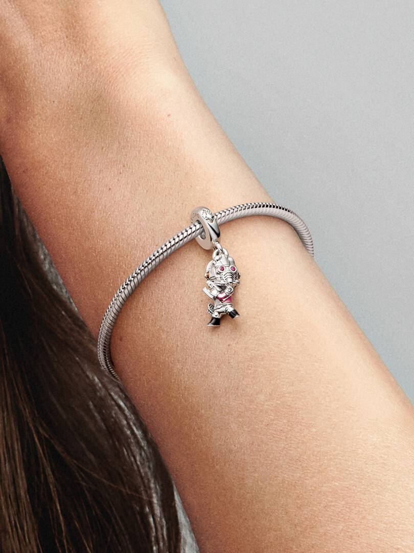 Crafted in sterling silver, Star-Lord is detailed with hand-applied enamel to accentuate his headphones, jacket and boots. Here to save the day, he holds his Quad Blaster and Walkman and wears his iconic helmet set with
