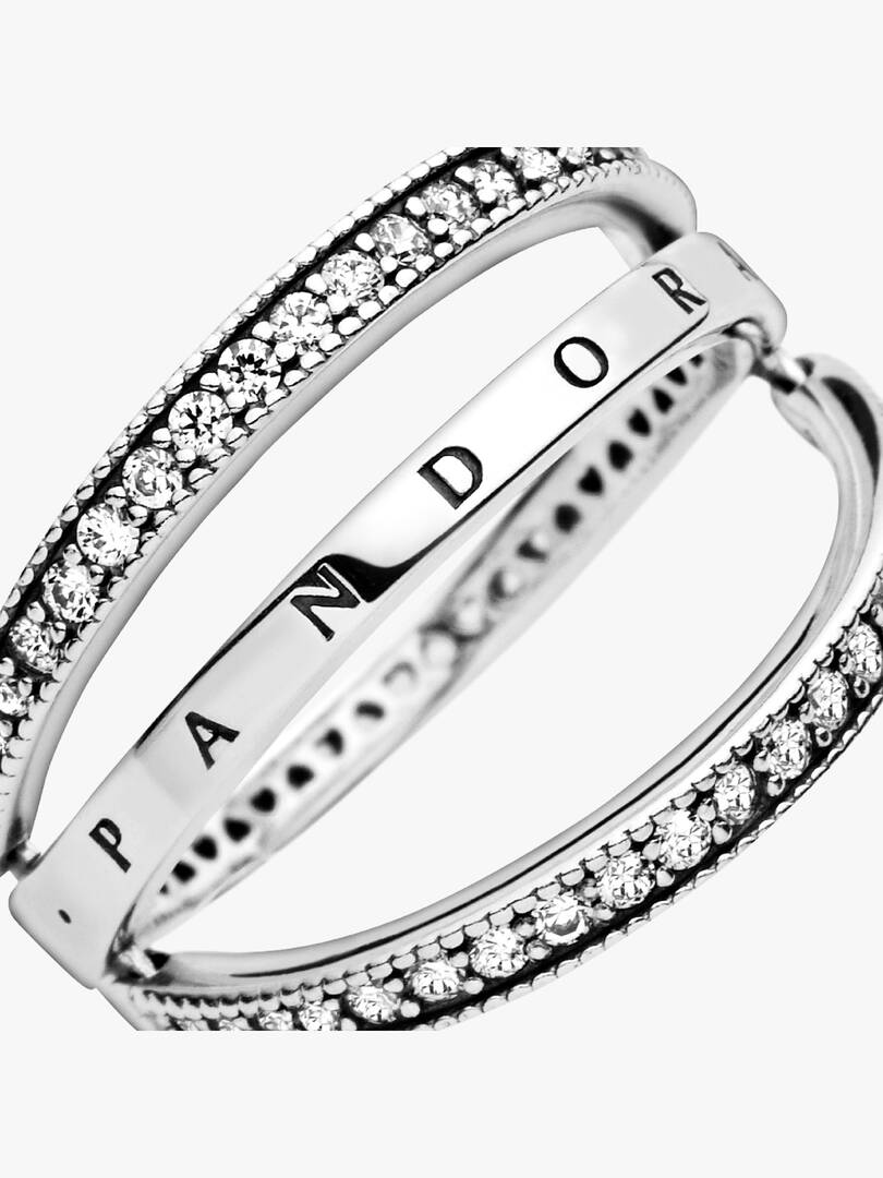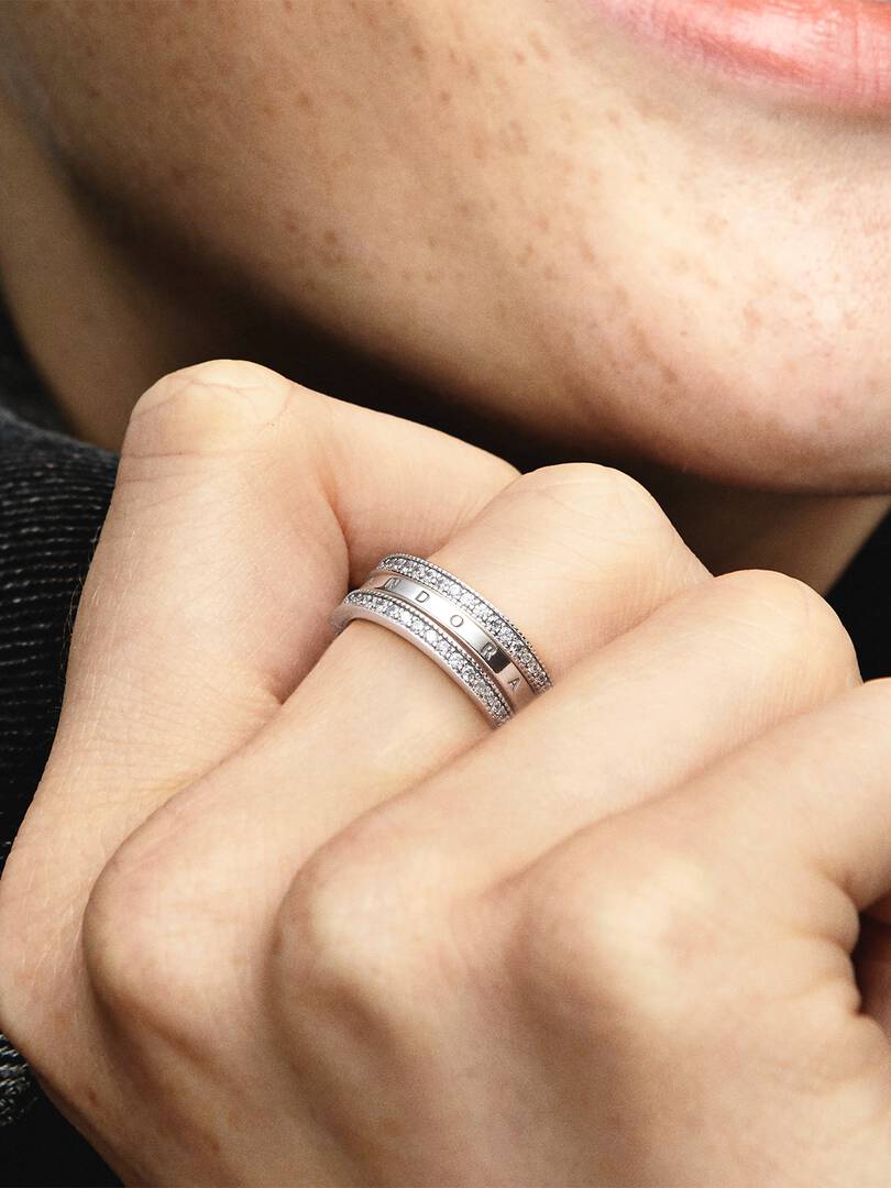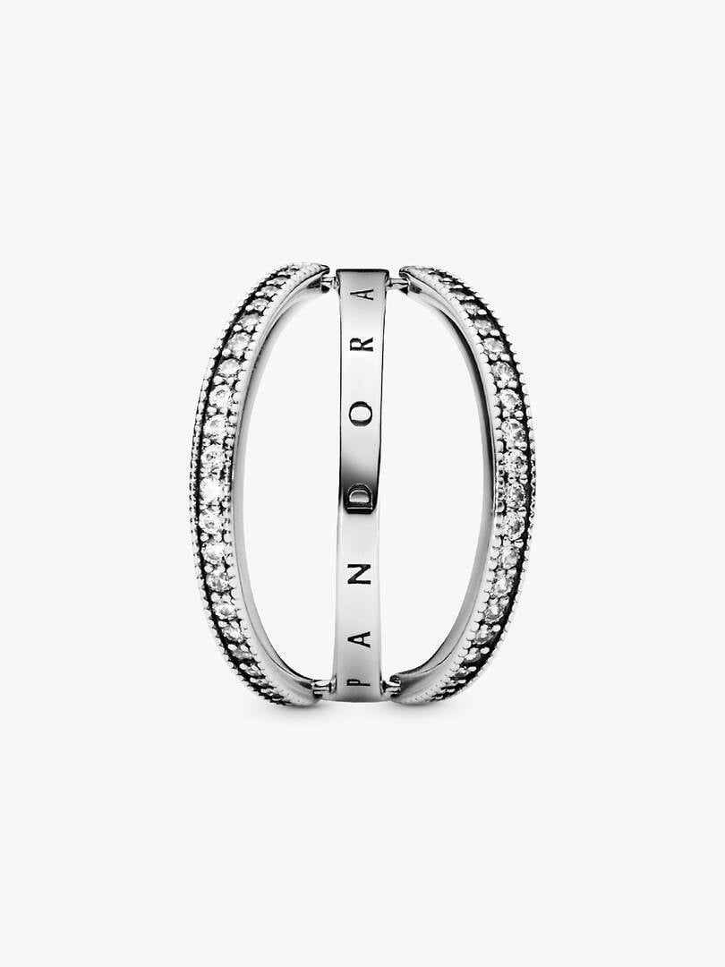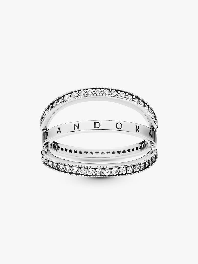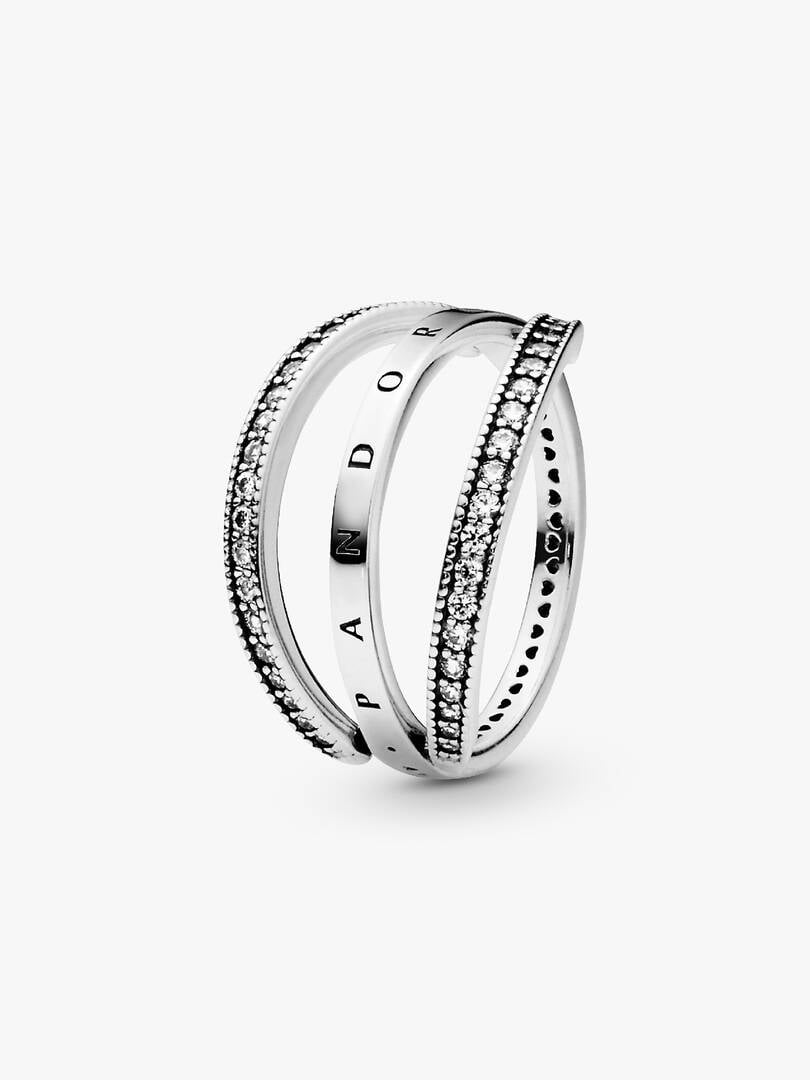 Create multiple looks with just one reversible ring in sterling silver, detailed with our logo and signature hearts. The hand-finished band ring features two lines of clear cubic zirconia that flip from side to side, so