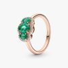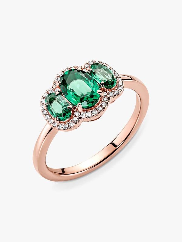Elevate any look with the Three Stone Vintage Ring. Hand-finished in our 14k rose gold-plated unique metal blend, this ring is set with two oval cut green crystals on either side of a large oval green center stone. A cle