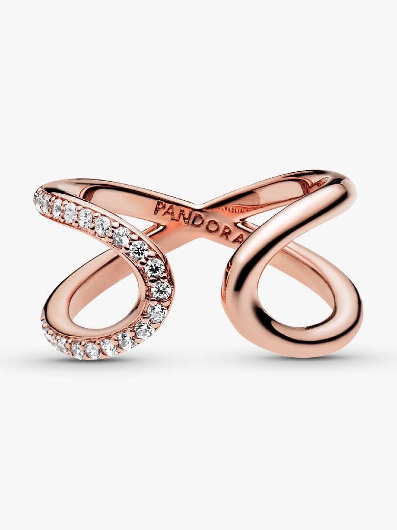 strikes. This 14k rose gold-plated ring is finished with 21 round brilliant-cut cubic zirconia, making it the perfect statement, symbolising the power of an infinite connection through its directional design and generous dimensions.