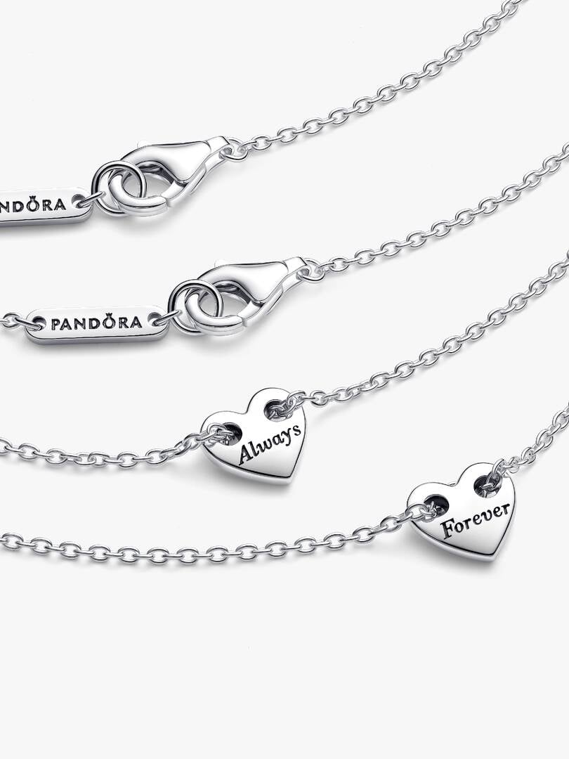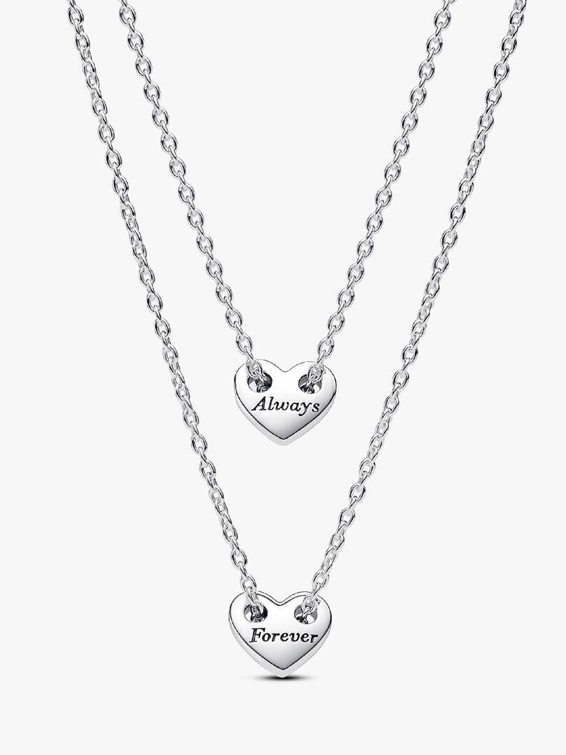 Keep eternal bonds close with our Forever & Always Splittable Heart Collier Necklaces. Crafted in sterling silver, each of the polished heart-shaped pendants are placed on an individual necklace and feature the sweet eng