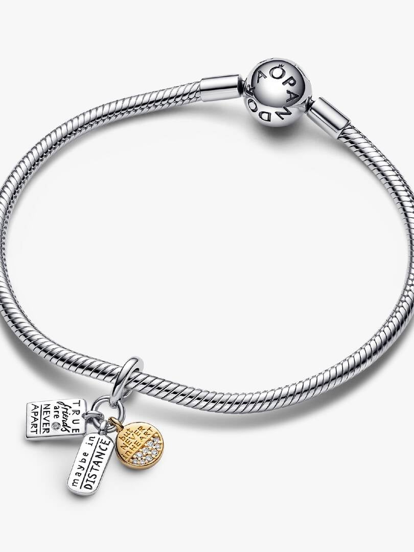A tribute to your forever friends. This two-tone friends charm has three dangles, with engravings that read “TRUE friends are NEVER APART”, “maybe in DISTANCE”, “but NEVER in HEART”, with pavé details and two interlinked