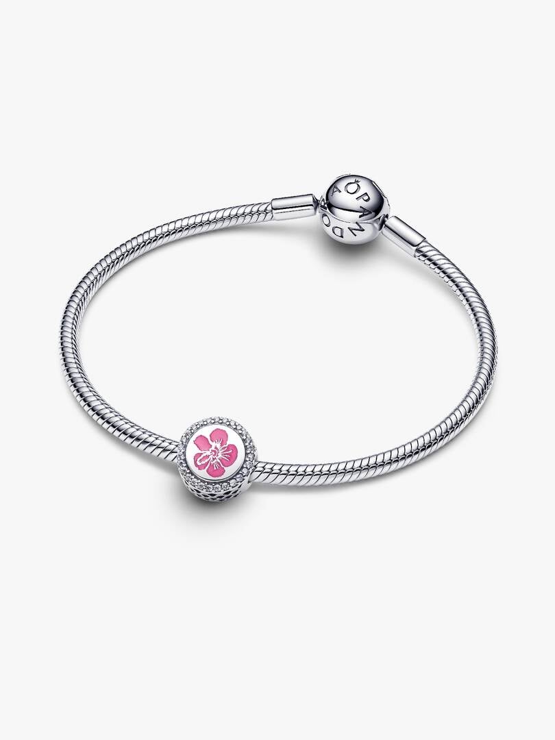 Bring a touch of tropical charm to your collection with this vibrant hibiscus flower charm. Crafted from sterling silver, it features a bright pink enamelled hibiscus on one side and “Hawaii” on the other. Wear it as a r