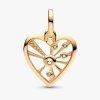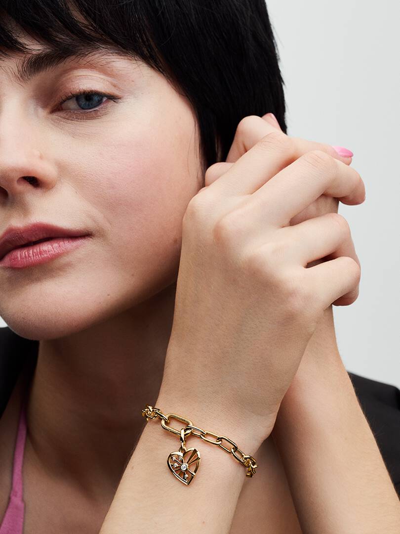 Keep positivity and love on your side with our Heart & Rays Medallion Charm. This heart-shaped 14k gold-plated medallion charm radiates light and energy. Nine golden rays shine out from one large brilliant-cut clear cubi
