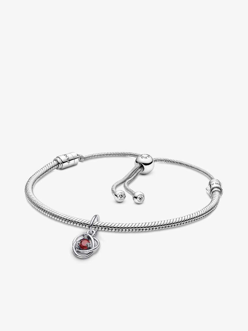 fiery red man-made crystal at the center. Surrounded by three small cubic zirconia stones on the front and a cut-out heart shape on the back for maximum sparkle. This dazzling dangle charm comes on a matching sterling silver brand Moments Snake Chain Slider Bracelet. Capture the symbolism of a July birthday, milestone or anniversary with this bold colored set. Unconditionally. Infinitely. Be love.