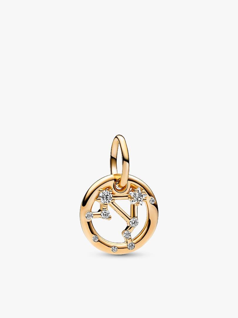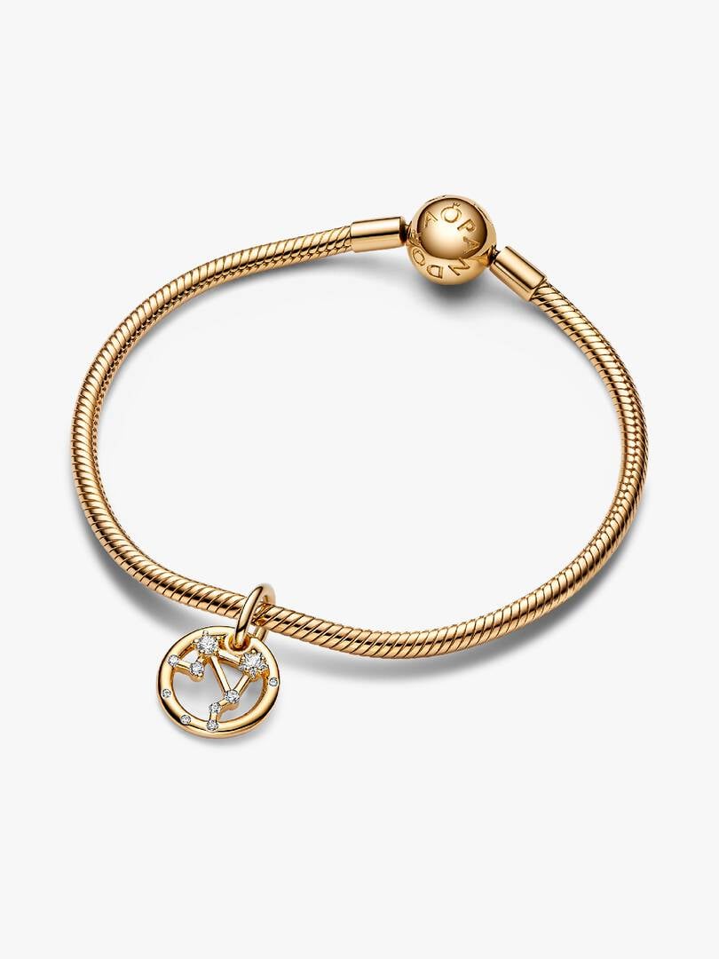 Let the stars guide your look with the Libra Zodiac Dangle Charm. The brand Moments dangle charm is crafted our 14k gold-plated unique metal blend, has a circular outer frame and features clear sparkling cubic zirconia