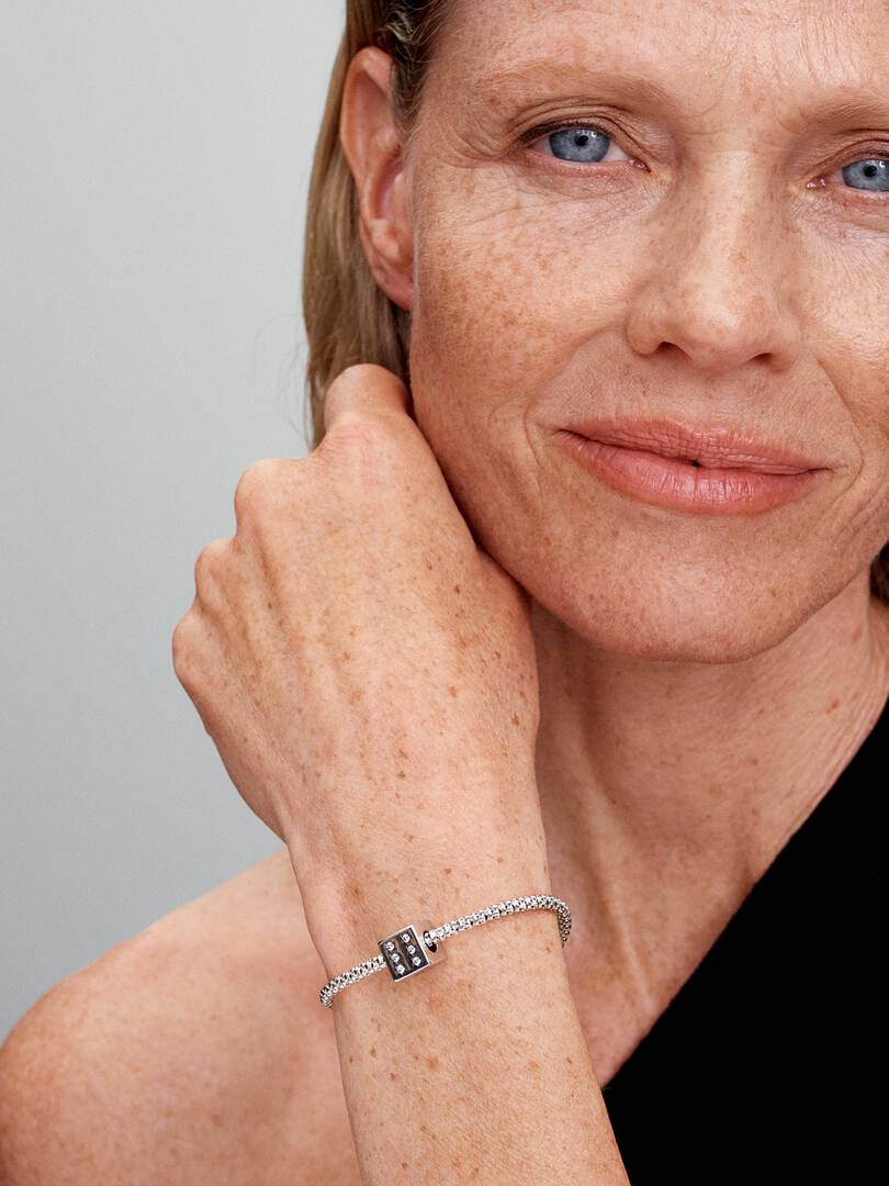 This six-sided sterling silver dice features round stones in star settings on each side representing numbers one, three, four and six.