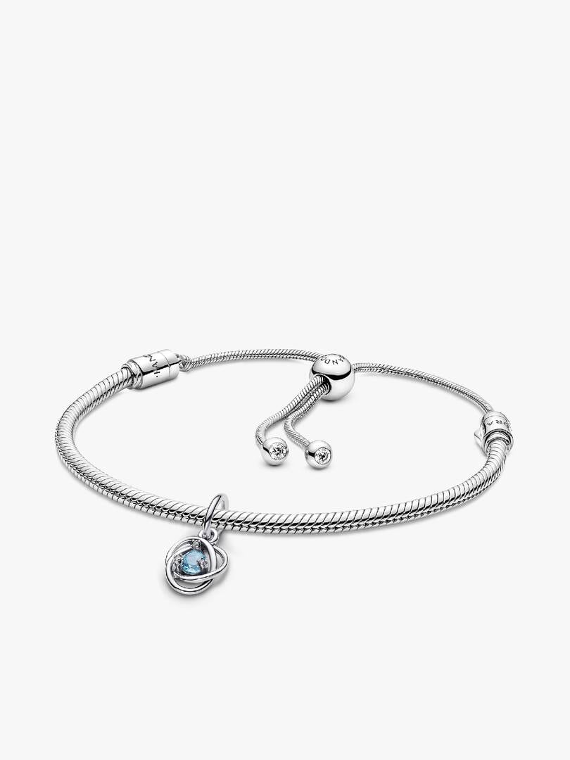 beautiful sea aqua blue man-made crystal at the center. Surrounded by three small cubic zirconia stones on the front and a cut-out heart shape on the back for maximum sparkle. This dazzling dangle charm comes on a matching sterling silver brand Moments Snake Chain Slider Bracelet. Capture the symbolism of a March birthday, milestone or anniversary with this brilliant set. Unconditionally. Infinitely. Be love.