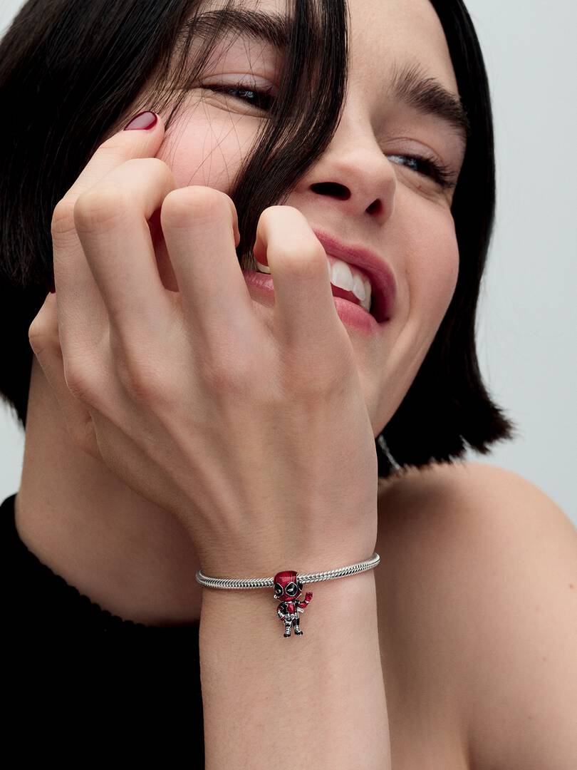 Pay tribute to a brave and goofy character with the Marvel Deadpool Charm. Marvel’s Deadpool is depicted in sterling silver with metallic-effect enamel in basse-taille technique revealing a woven pattern beneath Deadpool