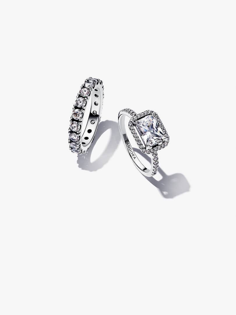 ngular radiant-cut stone as its centerpiece. The central stone is slightly raised so the ring can sit flush against the bold but simple eternity ring, with its full circle of cubic zirconia stones. Wear each ring on its own or style them together for an effortless, contemporary look with high-impact sparkle.