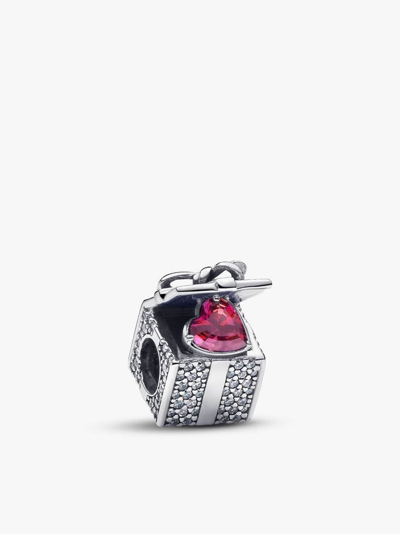 iconic outfit and lifelike facial details—his body even moves side to side for an extra playful touch. The second charm is an open present, adorned with ribbon details, sparkling pavé, and a radiant red heart-shaped stone inside. Engraved with the message “THE GIFT OF L♥VE,” it celebrates the joy of giving. Completing the trio, the red Murano glass charm glows warmly with golden foil and is wrapped in sterling silver Christmas trees, gingerbread men, and candy canes, adding festive cheer to any jewelry collection.