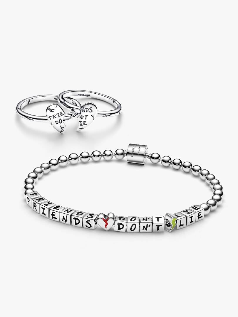 Inspired by the mantra of Stranger Things’ fiercely loyal heroine, Eleven: friends don’t lie. The sterling silver set includes a sharable friendship ring with a cracking heart motif and a retro-style friendship bracelet