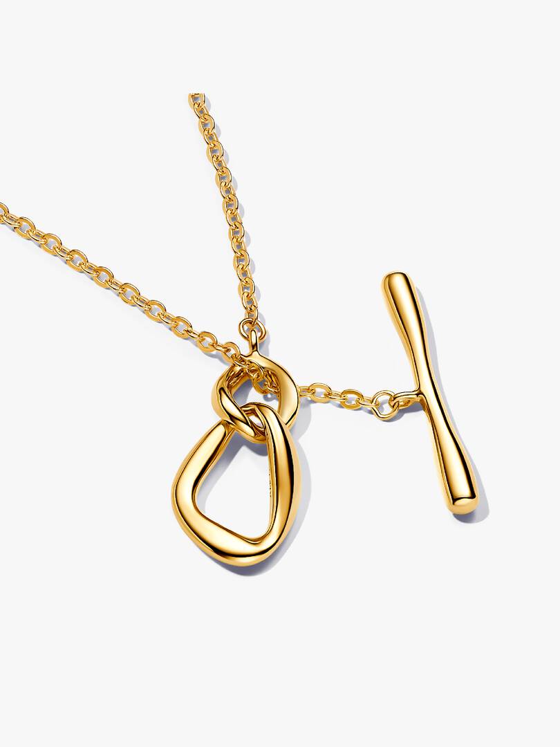 Choose sculptural style when you wear the Organically Shaped Circles T-bar Necklace. Two intentionally imperfect 14k gold-plated circles interlock, each with varying width and of slightly different size and shape. Close