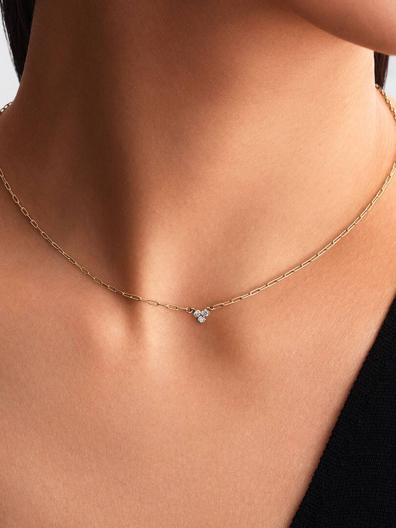Elevate your everyday look with this refined necklace, featuring a trio of lab-grown diamonds. Crafted from solid 14k gold, this adjustable piece is versatile for layering or as a standalone accent. The delicate cluster