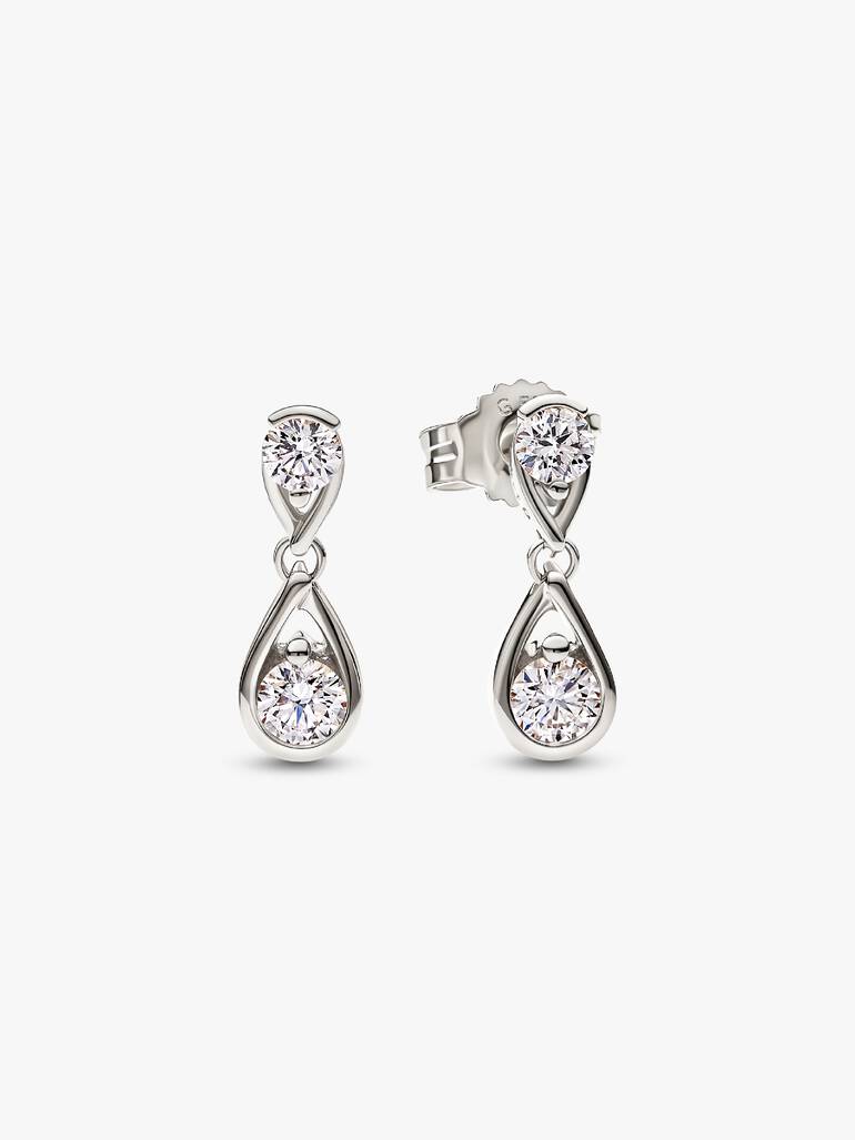 nds linked together to create an elegant drop style. A 0.10 carat lab-grown diamond is placed on the stud inside an infinity loop, appearing to float weightlessly in a prong-and-partial-bezel setting. A 0.15 carat lab-grown diamond dangles beneath, also encased inside an infinity loop. The modern design flows seamlessly around the stones, totaling 0.50 carat, to represent your eternal bonds. Each brand Lab-grown diamond is treated with a post-growth color enhancement called annealing.