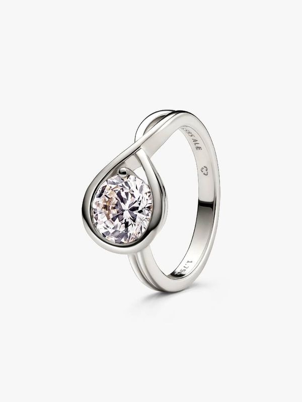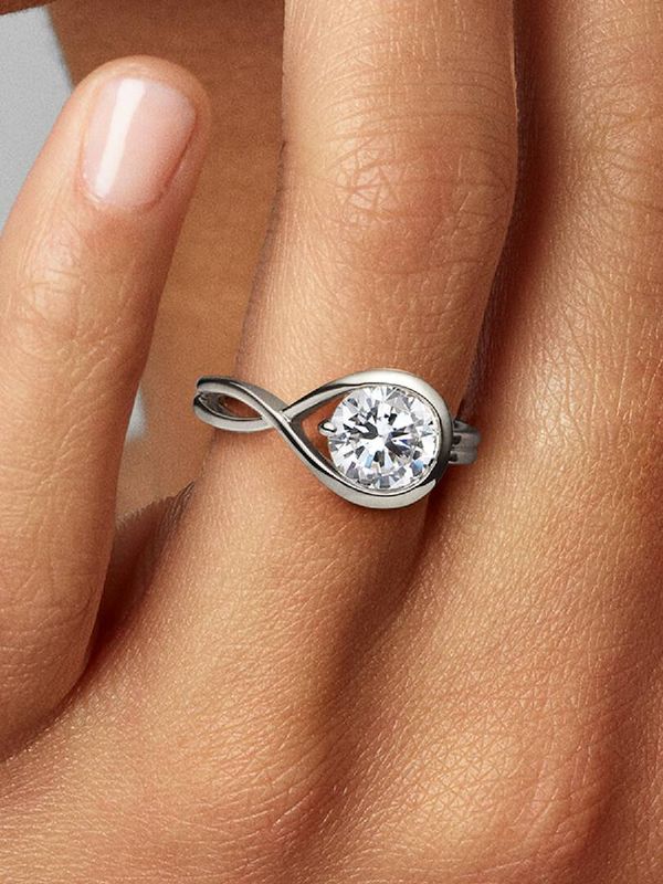 A solid 14k white gold ring hand-set with a 1.75 carat lab-grown diamond. A beautiful statement of empowerment, or an eloquent declaration of love. A modern infinity setting flows seamlessly around the round brilliant ex