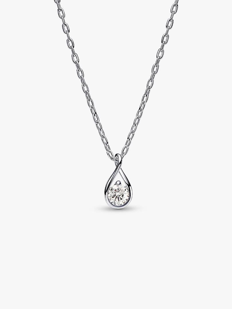 endant features a fiery round brilliant excellent cut lab-grown diamond in a modern infinity setting that flows around the stone and suspends it in mid-air. The chain is easily adjustable to two lengths. Each brand Lab-grown diamond is treated with a post-growth color enhancement called annealing.