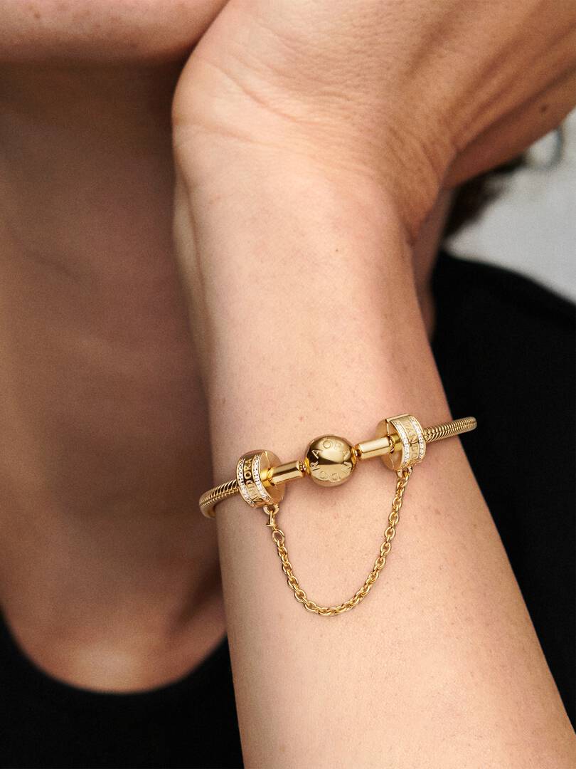 Keep charms in check with our brand Logo Safety Chain Charm, made for brand Moments bracelets. Plated with 14k gold, the clips are detailed with our logo as well as lines of cubic zirconia stones. The safety chain ch