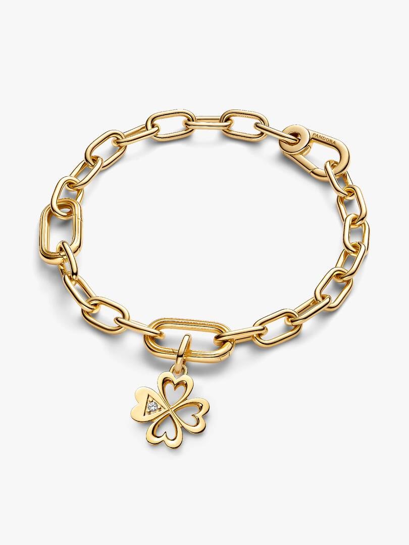 hearts and one solid heart set with a sparkling stone inside an triangle detail; the other side is covered in a microbead pattern on all four leaves. This clover medallion charm will bring a golden glow to your look while reminding you that you make your own luck. Compatible with brand ME and brand Moments.