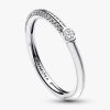 Brighten up your stack with our brand ME Pavé & White Dual Ring. A round brilliant-cut cubic zirconia sits between a row of shimmering pavé and hand-applied transparent glossy white enamel covering 2/3 of the sterling