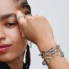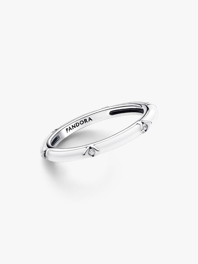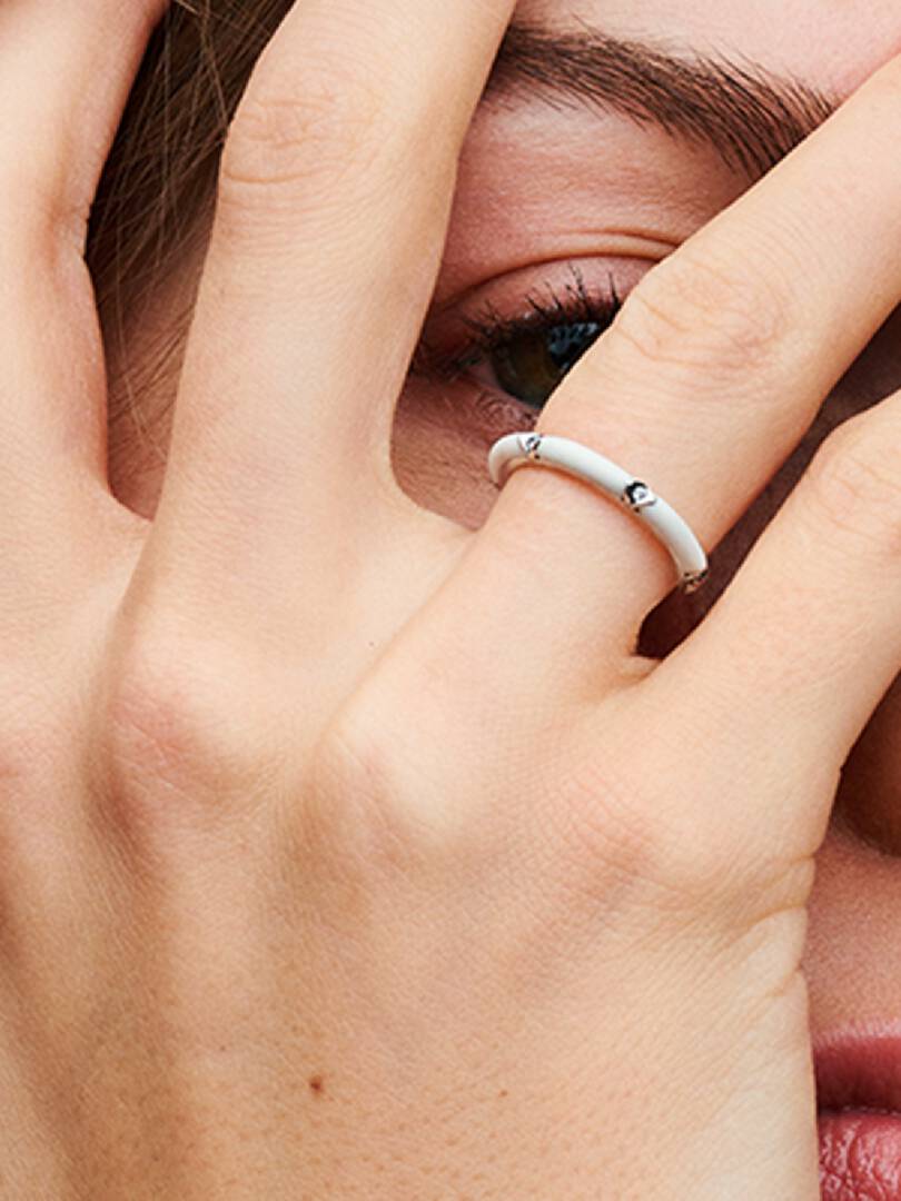 Add impact to your look with the brand ME Stones & Enamel Ring. This sterling silver ring features shiny white enamel punctuated by reverse pyramid-shaped indents set with sparkling stones. Pair it with other brand M