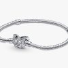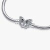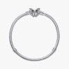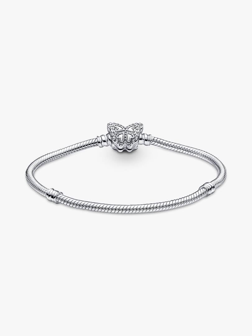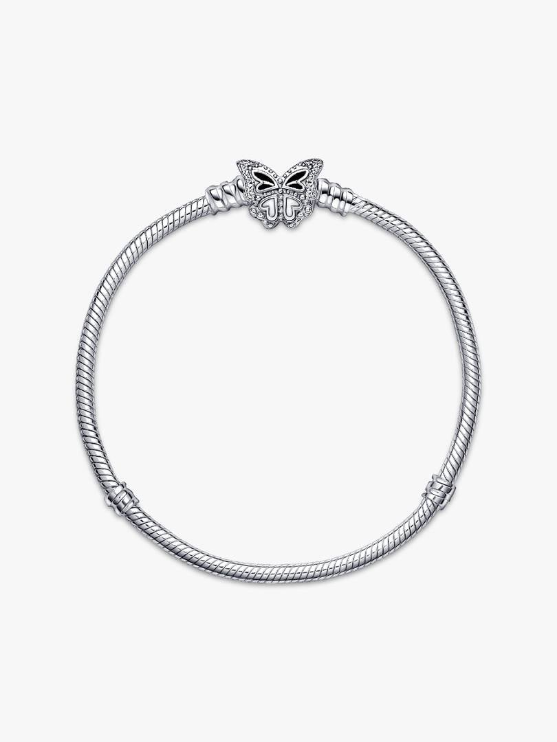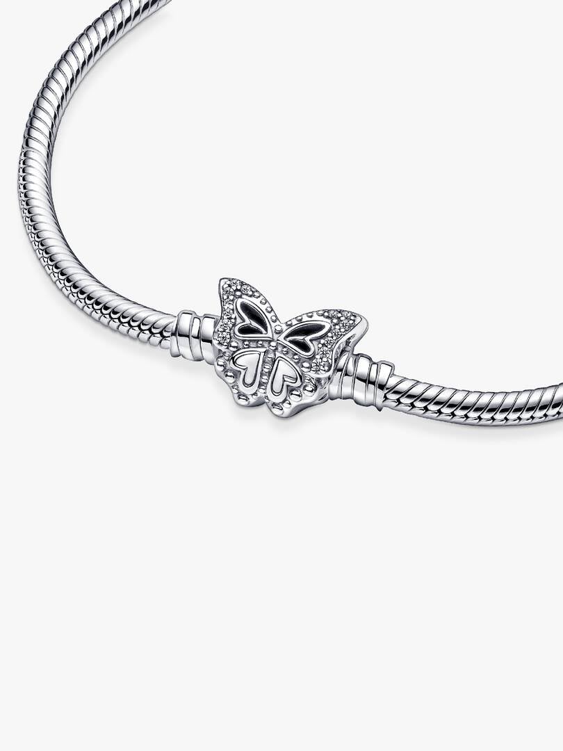 Tell your spring story and be inspired by the season of transformation with our sterling silver brand Moments Butterfly Clasp Snake Chain Bracelet. Cut-out and raised heart details and sparkling bead-set round brillian