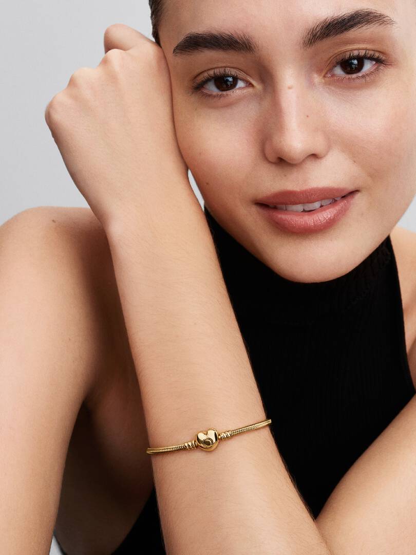 Take pride in your style with the brand Moments Heart Clasp Snake Chain Bracelet. Hand-finished in 14k gold, this design includes a heart-shaped clasp. Featuring our iconic snake chain, the bracelet has threaders and s