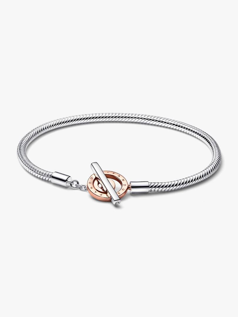 Make a statement with this bold and graphic piece. Inspired by our iconic pendant design, the brand Moments Two-tone Logo T-Bar Snake Chain Bracelet features a duo of 14k rose-gold plated circles forming a closure that