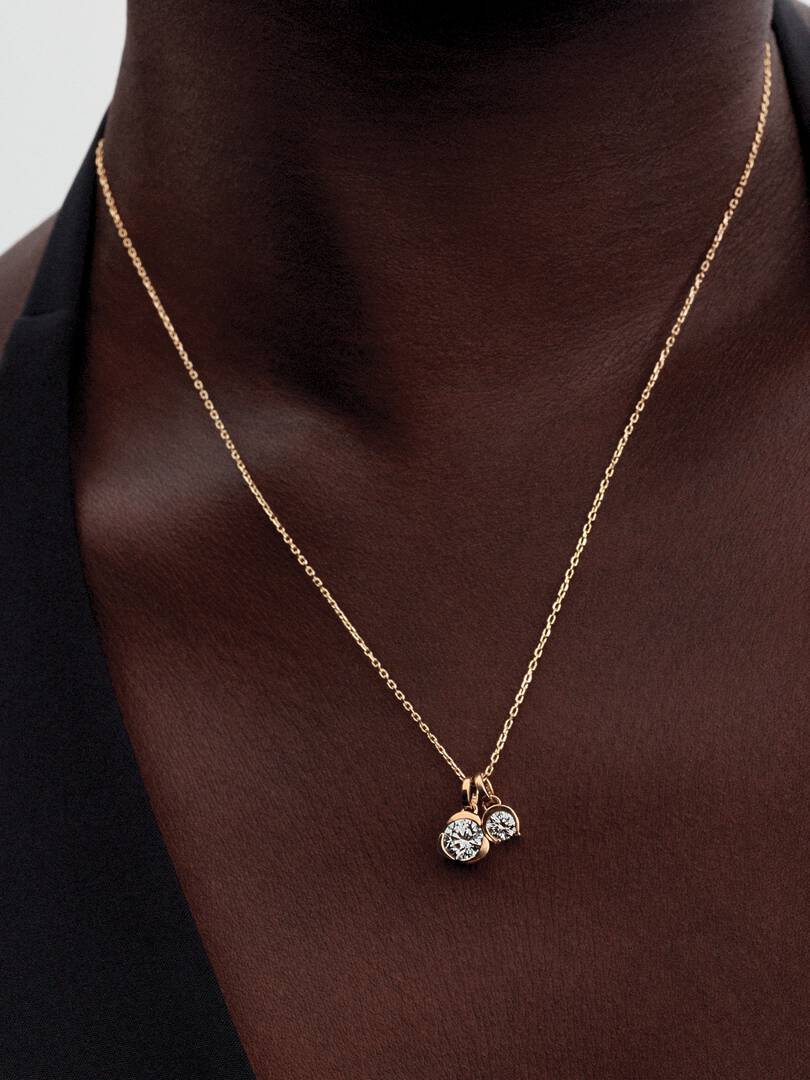 the back of the pendant, a heart-shaped cut-out echoes the shape of the setting and lets the light shine through to maximize sparkle. A universal symbol of love, the heart shape makes this pendant the perfect gift to represent a special connection – or an affirmation of the love you have for yourself. Each brand Lab-grown diamond is treated with a post-growth color enhancement called annealing.